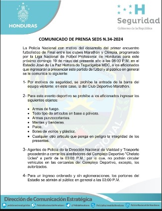 La Policía Nacional de Honduras anunció que varias calles cercanas al Estadio Nacional 'Chelato Uclés' estarán cerradas este domingo a causa de la final entre Olimpia y Marathón donde uno de ellos se coronará como campeón del Clausura 2024 de la Liga de Naciones de Honduras.