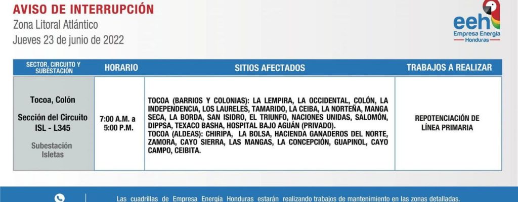 De acuerdo con el consorcio colombiano y la empresa estatal eléctrica, son decenas de barrios y colonias del occidente, noroccidente, Litoral Atlántico y zona central de Honduras las que estarán sin el servicio, por mantenimiento general de circuito, repotenciación y reubicación de línea primaria.