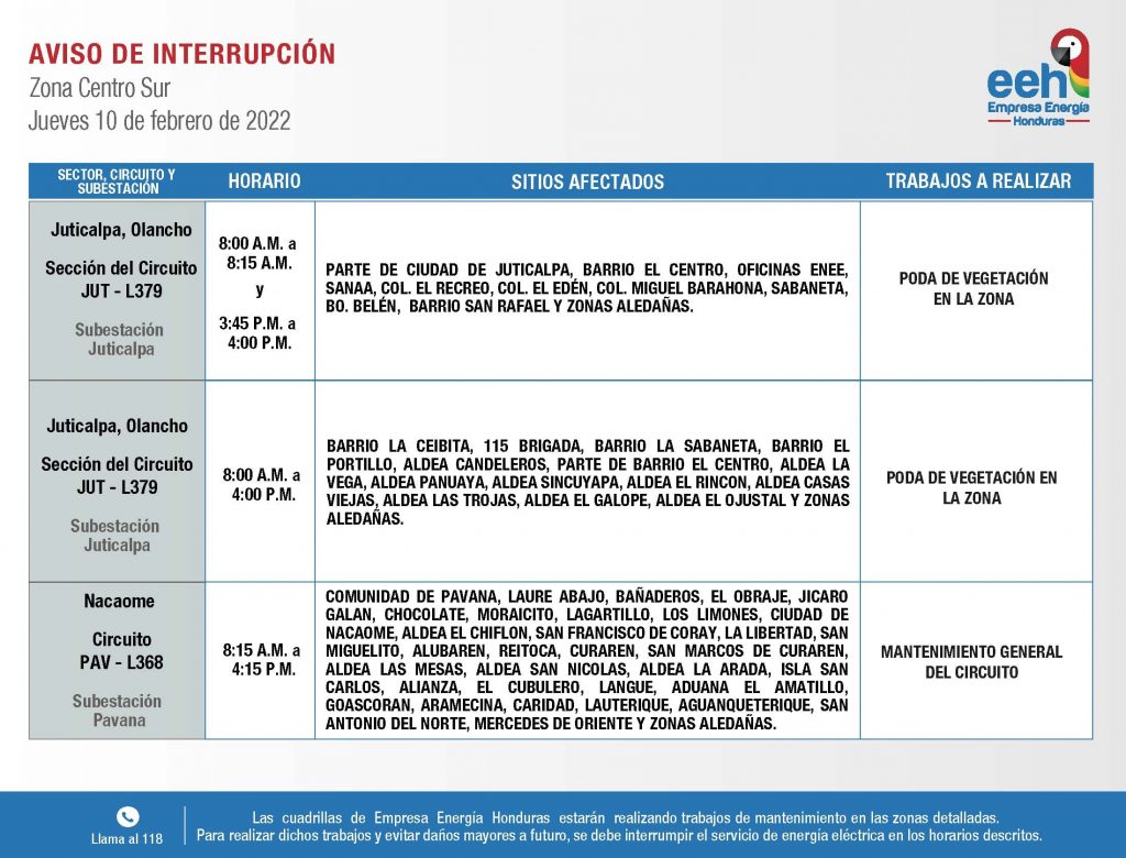 De 8:00 a.m. a 4:00 p.m.: ciudad Juticalpa; barrio el Centro; El Recreo; El Edén; Miguel Barahona; Sabaneta; Belén; San Rafael, y zonas aledañas.