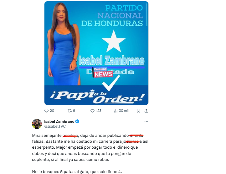La reconocida periodista deportiva Isabel Zambrano desató polémica en redes sociales al responder de manera tajante a un usuario de X, antes Twitter, quien aseguró que la comunicadora estaría buscando una candidatura a diputada por el Partido Nacional.