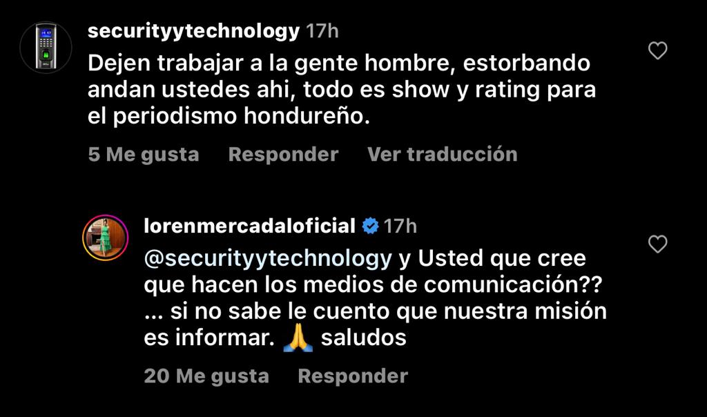 Otro usuario de Instagram atacó a Mercadal diciendo "dejen trabajar a la gente hombre, estorbando andan ustedes allí, todo es show y rating para el periodismo hondureño", algo que a Loren no le pareció.