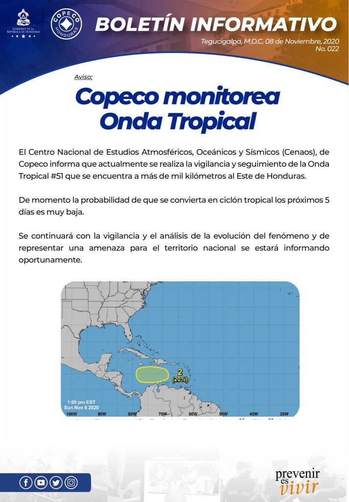 Un nuevo fenómeno natural amenaza el territorio hondureño, solo una semana después del catastrófico paso de la depresión tropical Eta, que afectó a más de 1.8 millones de personas en el país. De acuerdo con el Centro Nacional de Estudios Atmosféricos, Oceanográficos y Sísmicos (Cenaos), se trata de una nueva onda tropical que se encuentra a unos mil kilómetros de Honduras